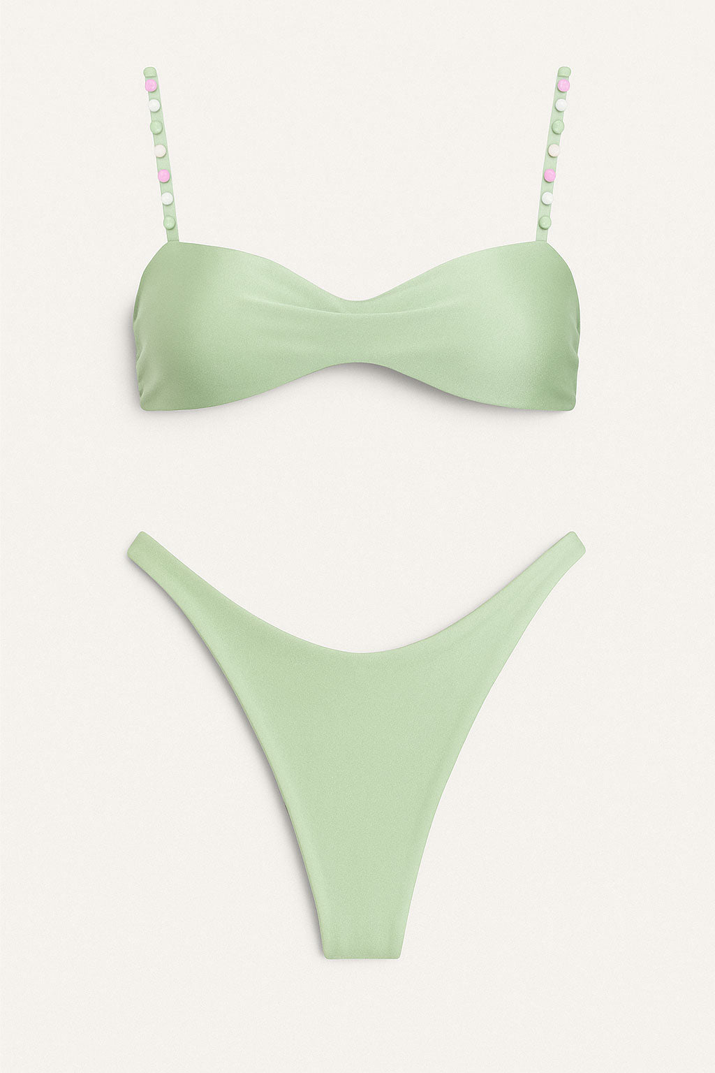 The Lagoon Top in mint green is a soft-structured bikini top designed for natural shape and comfort. It features adjustable shoulder straps and a delicate tie-back closure for a custom fit. Handcrafted tagua accents on the straps add a subtle artisan touch.